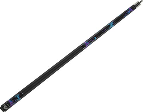 Brand new for Athena. Teal and purple butterflies on a black background. The butt plate features the teal and purple butterflies. All of that sits just above the newly designed Athena logo in sharp silver. And, of course, the cue has a stylish black Irish linen wrap.