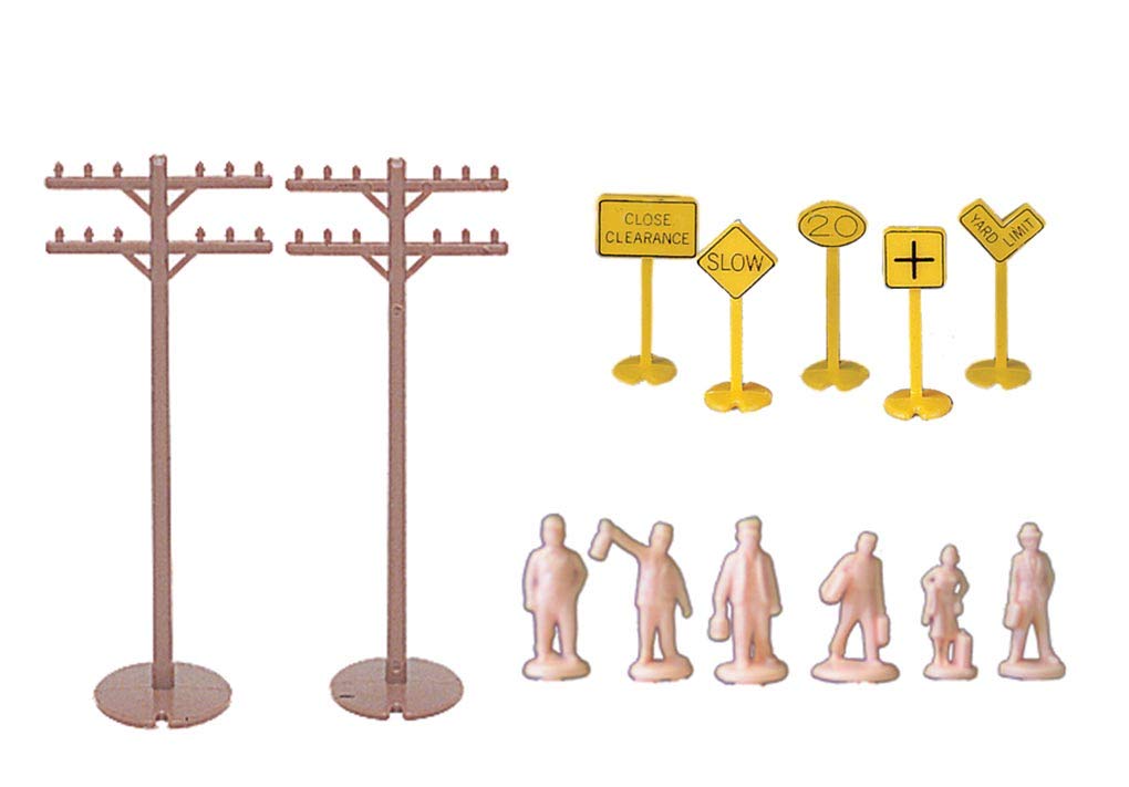 Bachmann HO Scale Accessories 12 Telephone Poles/24 Signs/24 Unpainted Figures