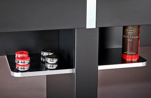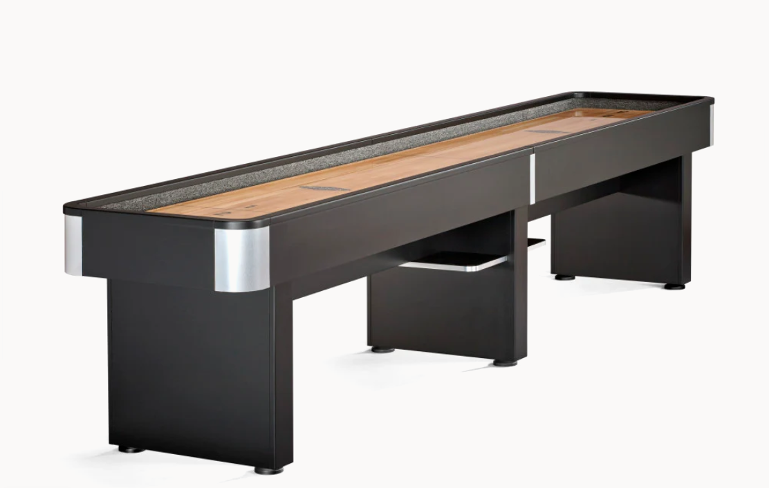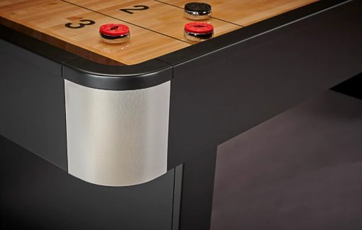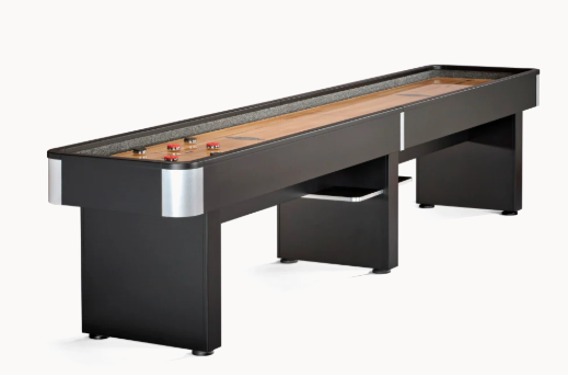 If you take your fun seriously, the Delray is ready and waiting for you to bring your best game. This shuffleboard table features a streamlined, contemporary design with matte black finish, handsome silver metallic textured laminate corners, a 20" wide / 2.5" thick play surface of North American Maple wood(protected with polymer resin and a lifetime warranty) on the 12'. Our 9' option comes with a 16" wide 1 1/2" thick play surface of North American Maple wood(protected with polymer resin and a lifetime warranty). Four open shelves (under the cabinet at the center of the table) provide ample storage for the included accessories (four black pucks, four red pucks, stainless abacus scorer, table brush, and shuffleboard wax) or any other item you'd like to keep handy.
