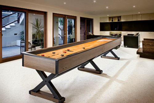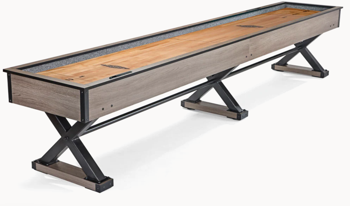 The Premier shuffleboard features a modern yet rugged style and a robust "X" foundation. With ultra clean lines, the Premier Shuffleboard matches the popular Premier Air Hockey and Premier Foosball suite. Whether the focal point of your game room or complimenting other games in the suite, the Premier Shuffleboard promises to deliver the quality and playability Brunswick Billiards fans count on.