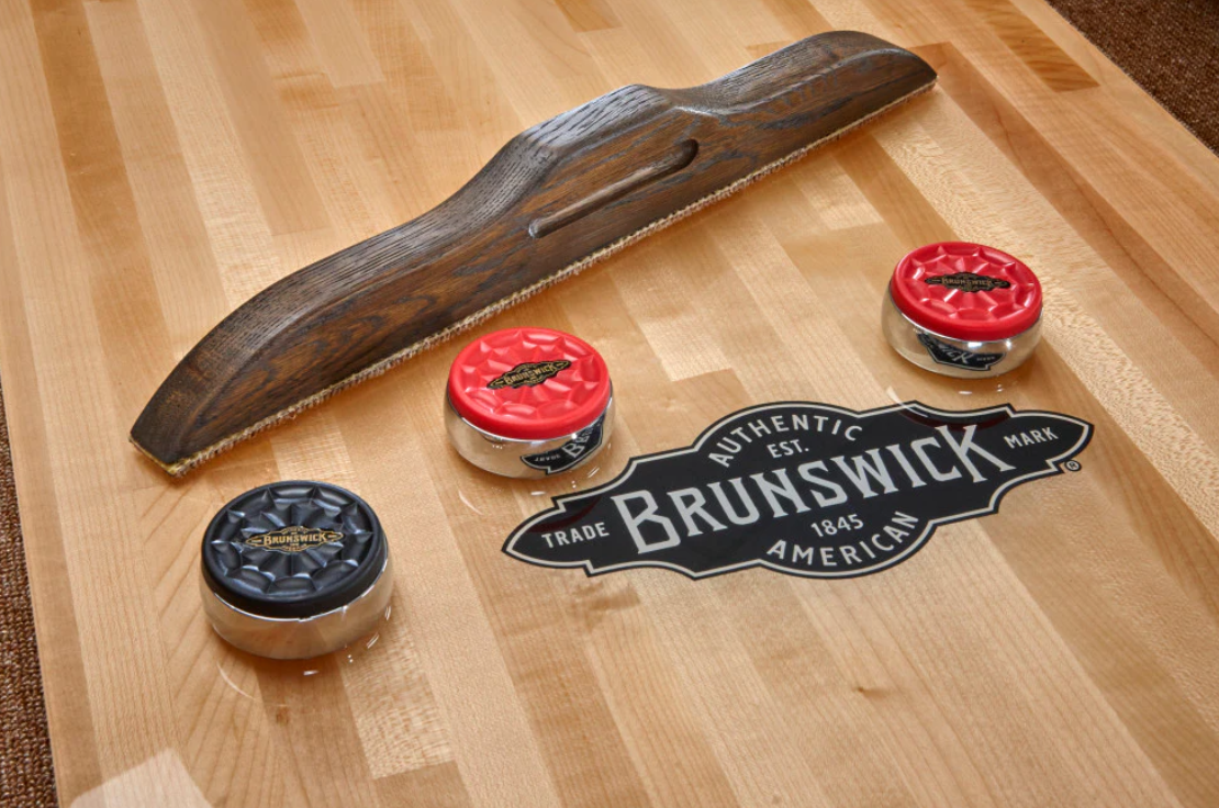 Accessories include four black weights, four red weights, built-in abacus scoring system, table brush, and shuffleboard wax