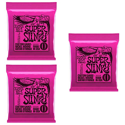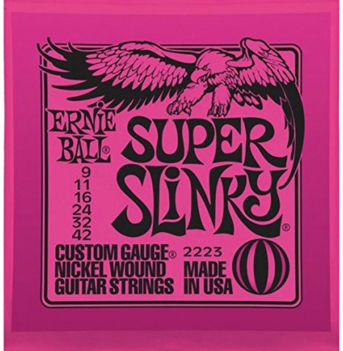 Ernie Ball Super Slinky Electric Strings are played by Jimmy Page, Jeff Beck, and Angus Young. These strings are precision manufactured to the highest standards and most exacting specifications to ensure consistency, optimum performance, and long life. Super Slinky wound strings are made from nickel plated steel wire wrapped around a hex shaped steel core wire. The plain strings are made of specially tempered tin plated high carbon steel; producing a well balanced tone for your guitar.
