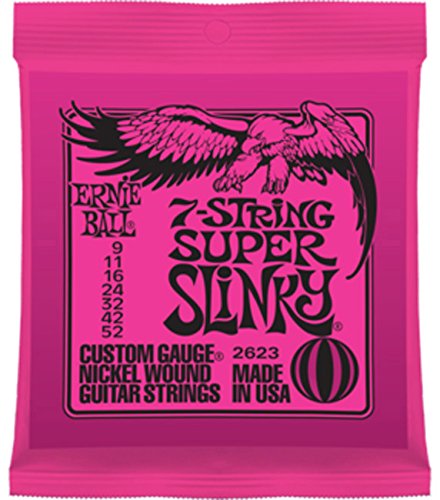 Ernie Ball 7 String Super Slinky Strings are widely revered for their world class tone. These strings are precision manufactured to the highest standards and most exacting specifications to ensure consistency, optimum performance, and long life. Ernie Ball 7 String Super Slinky wound strings are made from nickel plated steel wire wrapped around a hex shaped steel core wire.  The plain strings are made of specially tempered tin plated high carbon steel; producing a well balanced tone for your guitar.