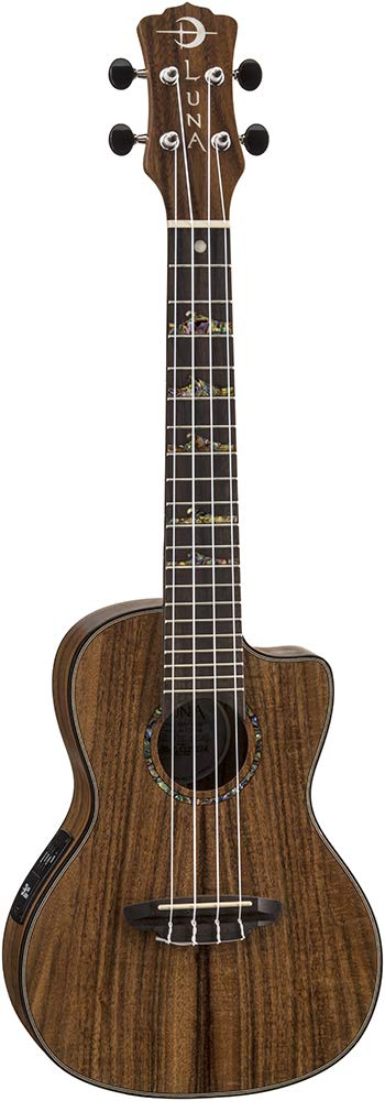 The "High Tide" Series is Luna's premier line of Ukuleles. This beautiful series of Ukes takes it's inspiration from the full moon at the first fret which causes the abalone wave fret markers below it to "rise" as they make their way up the fretboard towards the moon's pull. High-Tide ukes are crafted from exotic tropical hardwoods and soundhole framed by an abalone ring. This beautiful Luna ukulele features a deep koa body, producing full, deep sound along with the instrument's concert body size. The cutaway offers comfort when accessing the upper-register frets, and the nato/mahogany neck and rosewood bridge and fretboard add lasting sustain and clarity to your tone. The open-style tuners keep the instrument in precise tuning and the onboard preamp provides easy amplification that can be dialed in quickly. Dressed in a satin finish and featuring a rosewood binding, you won't believe your eyes with the ukulele's natural beauty.