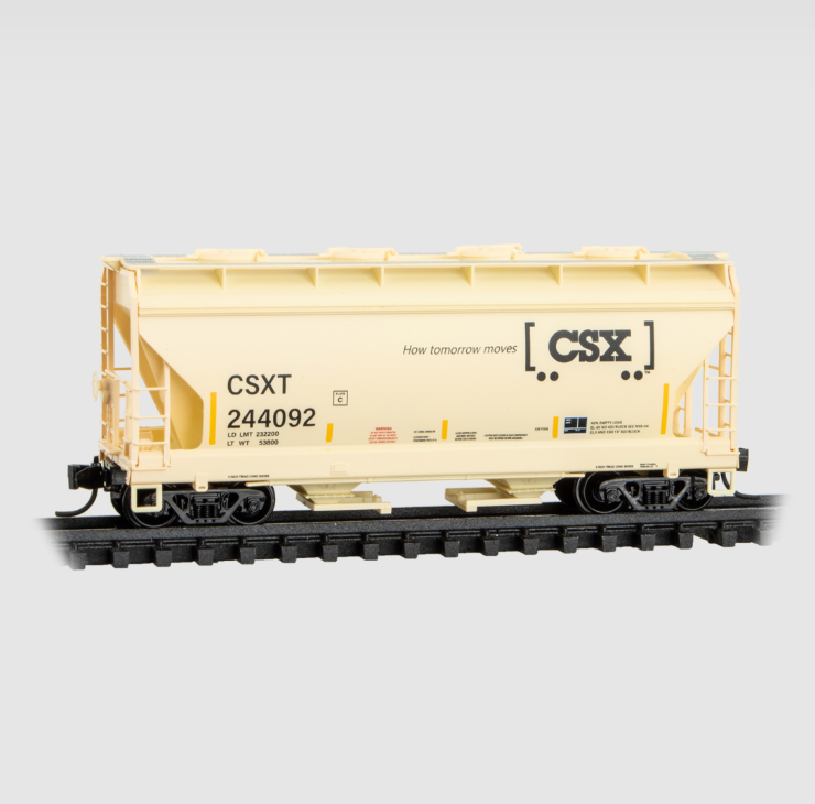 This 3,250 cubic foot capacity CSX 2-bay covered hopper was built in 2015 by Gunderson, and features the CSX boxcar logo with slogan “How tomorrow moves.” CSX was formed through the 1986 mergers of Chessie System and Seaboard System / Family Lines, and continues to operate today across more than 21,000 miles of track in the Eastern United States