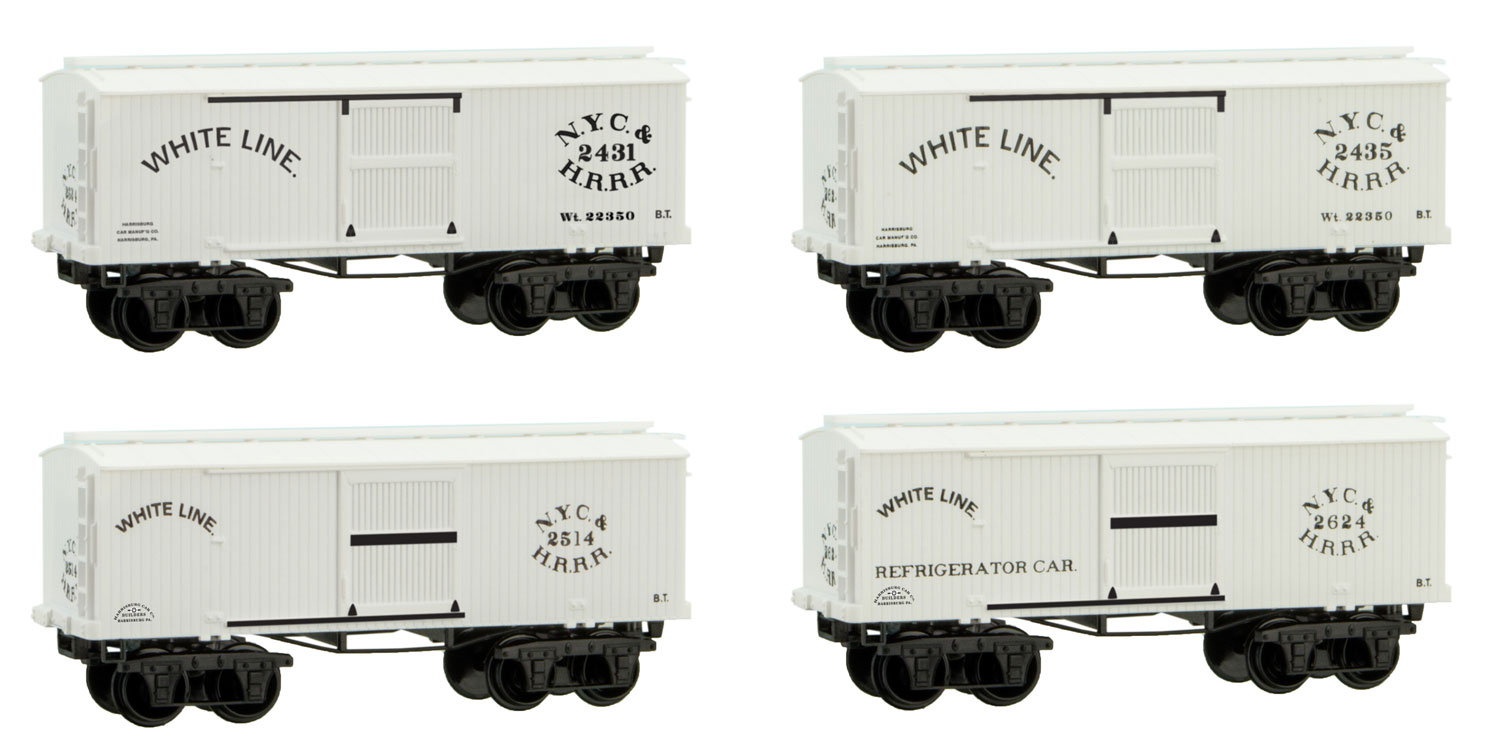 This four-pack of 26ft. Cival War Era Box Cars are decorated for CWE White Line and numbered 2431, 2435, 2624, and 2514