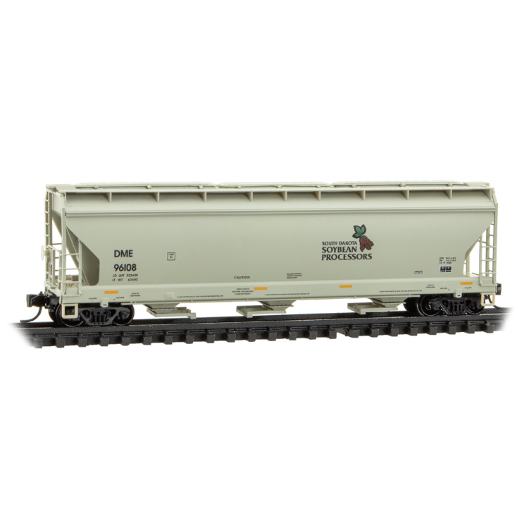 This Dakota, Minnesota & Eastern Railroad 3-bay covered hopper was built in 1998, and lettered for South Dakota Soybean Processors. The DME Railroad was the largest Class II railroad in the United States, which operated across several midwestern states until 2008 when it was purchased by the Canadian Pacific Railroad. Today, the DME is a wholly owned subsidiary of Canadian Pacific Kansas City.