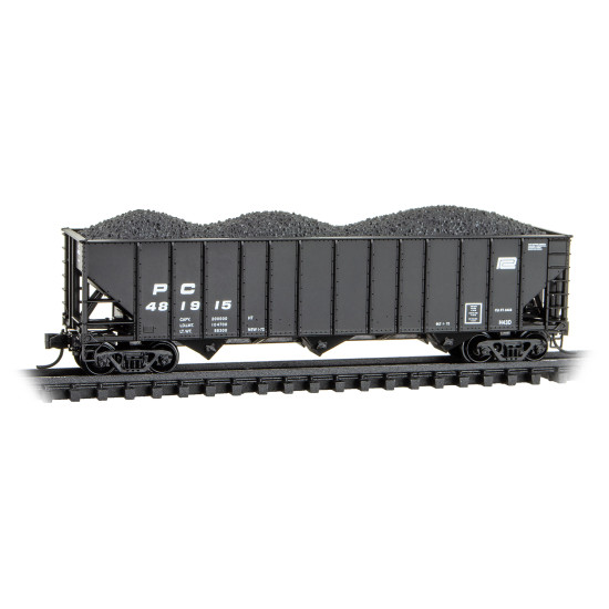 Built in the early 1970s for Penn Central in a series of over 2500 cars, this H43d-class 3433 cubic-foot capacity 3-bay hopper with Barber Roller Bearing trucks was used in coal service. Penn Central was formed through the merger of Pennsylvania Railroad and New York Central, and operated until 1976 when it was rolled into Conrail Corporation.