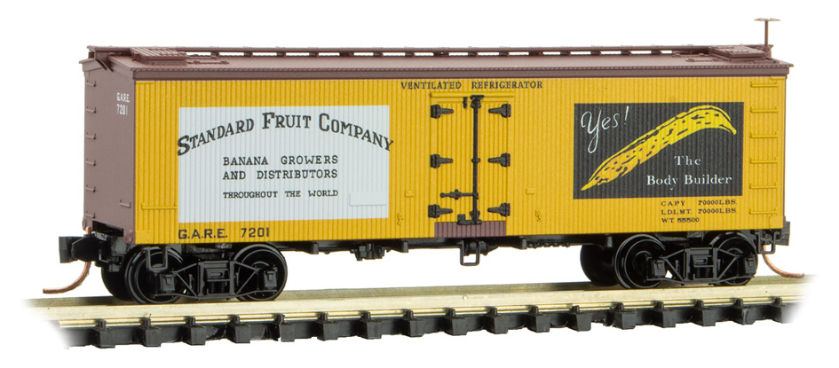 This 36’ wood sheathed ice reefer is brown with yellow decorated sides and runs on Arch Bar trucks. According to photo records from the 1920s, this Standard Fruit Company paint scheme was only a concept, and never existed in real life. GARE 7201 was envisioned as a lease car from General American advertising for the Banana Growers and Distributers throughout the world.