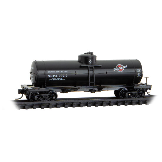 This 8,000-gallon capacity insulated tank car was built for Shippers Car Line and was designed for vinyl acetate service. It featured a new welded dome design, called “Duradome,” replacing older riveted designs. Shippers Car Line was acquired by American Car & Foundry in 1927, and leased an enormous fleet of tank cars to a diverse assortment of industries, from chemical plants to wine processors.