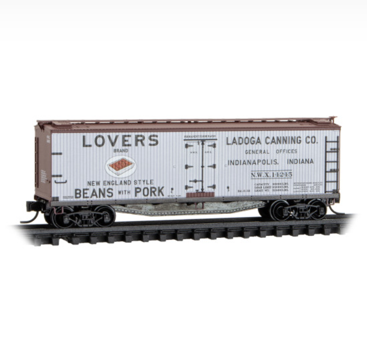 Built in April 1926, this North Westen Refrigerator Line owned car was leased to Ladoga Canning Company of Indianapolis, Indiana, and featured Lovers Brand New England Style Beans & Pork. The Ladoga Canning Company was founded in 1903 by brothers Harold and Clay Bachelder. Ladoga specialized in tomato and bean products, but also offered products like pumpkin, sugar corn, and a variety of soups.