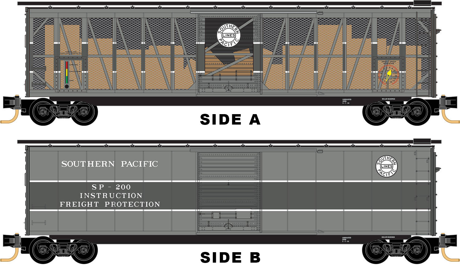 Southern Pacific® coverted this 50’ box car with plexi-glass on one side and standard solid steel on the other. It became known as the ‘Impact’ car used for freight protection instruction - switchmen and trainmen oberved the effect of coupling whne speeds exceed the safe limit of 4 miles per hour or more. To demonstrate the impact, loose skids, cartons, or barrels would be placed inside the car and a ‘handling thermometer’ measures the damage, an impact speed indicator (speedometer) measures the coupling speed.