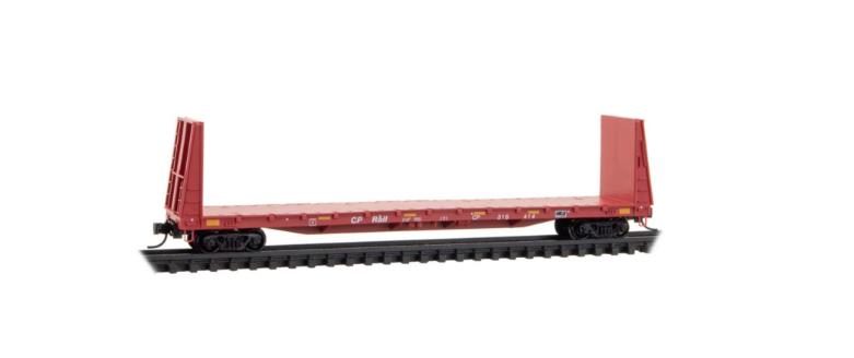 This bulkhead flat car was built in 1971 by National Steel Car Co. It belonged to a series of 600 cars in the Canadian Pacific fleet. Incorporated in 1881, Canadian Pacific Railway is one of the largest Class 1 Railroads in Canada, owning over 12,000 miles of track in Canada and the United States. Among the earliest types of freight cars, flatcars continue to serve as a valuable part of railroading. Flatcars are used to move a wide variety of loads which do not require protection from weather. These cars are constructed with steel underframes, wood floors and stake pockets on the sides and ends for fastening tie-downs that keep loads from shifting.