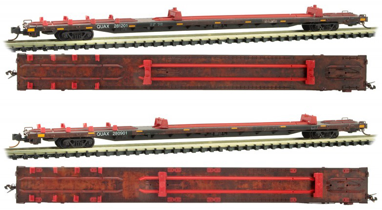 Redstreak Specialized Railcar Services (QUAX) has a fleet of 89’ flat cars that feature adjustable bolster pedestals and specialized retainment devices so they can safely load, transport and unload damaged railcars and their trucks, increasing the likelihood of repair. Redstreak rents or leases these cars to most Class 1 railroads and many shortlines, making these cars likely to be found nearly anywhere in the country carrying a variety of damaged railcars.