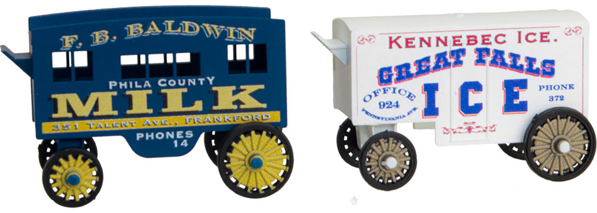 Milk and Ice Wagon 2-Pack. Decorated for F.B. Baldwin Milk Company Philadelphia and Kennebec Ice Great Falls.