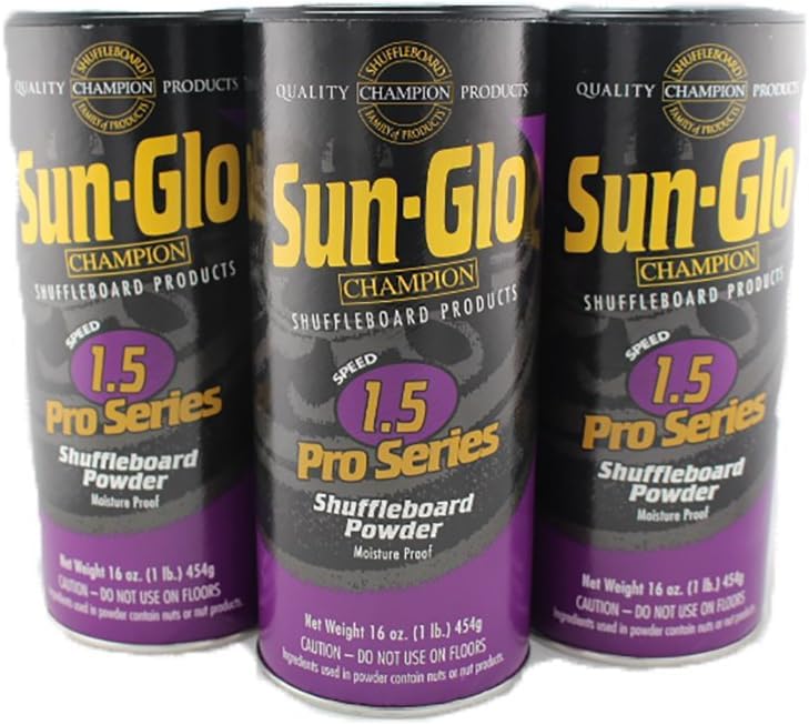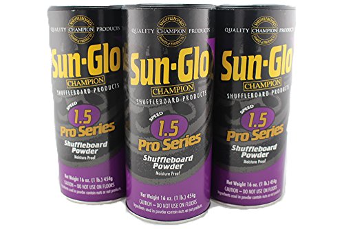 Sun-Glo #1.5 Speed Wax Powder Three 16 oz. cans. The second fastest powder available. The 1.5 powder is recommended and requested by most players today.Sun-Glo silicone powder wax is specially compounded to not lump or injure any playing field surface. Preferred by professionals and used in tournaments everywhere, Sun-Glo is the best bet for your shuffleboard needs!
