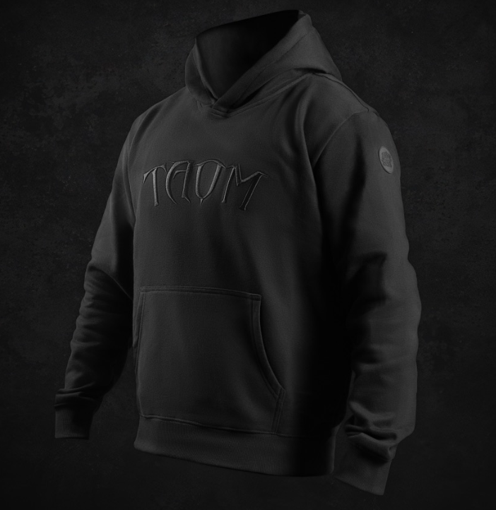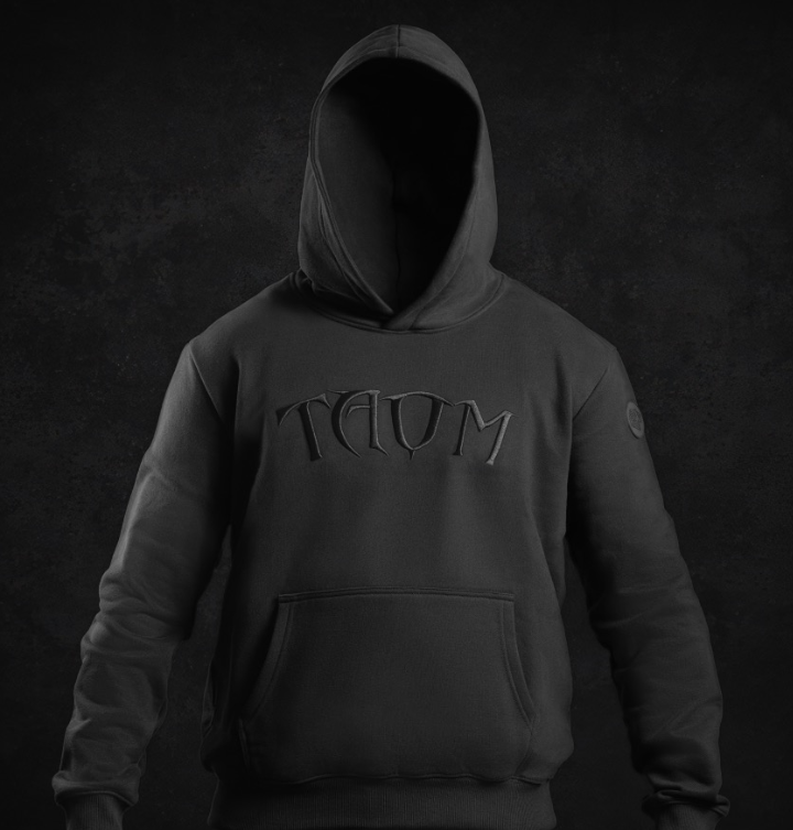 A comfortable, stylish black hoodie featuring a black Taom wordmark on the chest and the Taom lion emblem on the shoulder. Made from a soft cotton-polyester blend for everyday comfort and durability. Ideal for casual wear or cue sports events.