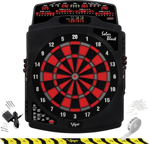 The Viper Solar Blast is made of "Target Tested Tough", commercial grade nylon segments that out perform conventional plastic. Meanwhile, this 15.5" regulation dartboard is outfitted with four top-mounted 0.5-by-4-inch LED cricket displays keeping track of up to 16 players at once. The scoring displays at the top provide a more natural line of sight for easier viewing when checking in on one's scores. Front mounting for easy hanging.