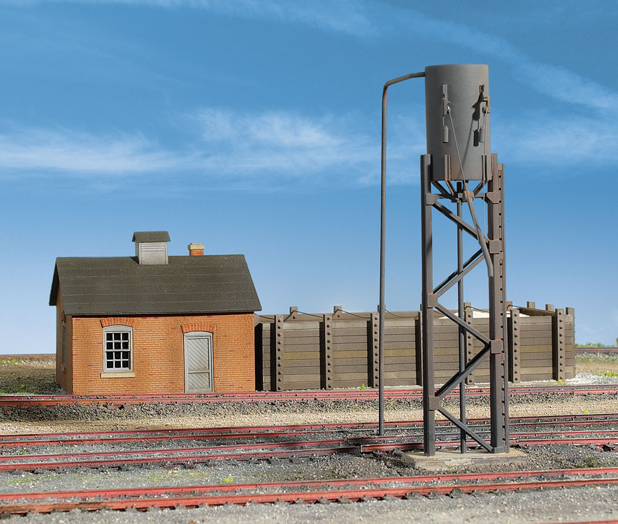 The Walthers Cornerstone HO Scale Sanding Towers and Drying House kit is essential for adding realism to steam and diesel-era locomotive servicing scenes. Every railroad had its own ideas about sand house construction, so most were built to meet local conditions and seldom followed standard plans. Since diesels also needed sand, these structures remained in service years after the last steamer had been retired. This model fits any busy terminal and includes a unique brick drying house, a large open storage bin, and piping. Both steam and a larger modern-era sanding tower are included to fit your modeling era. The Sanding Towers and Drying House kit is one of a wide variety of Cornerstone HO Scale railroad buildings.
