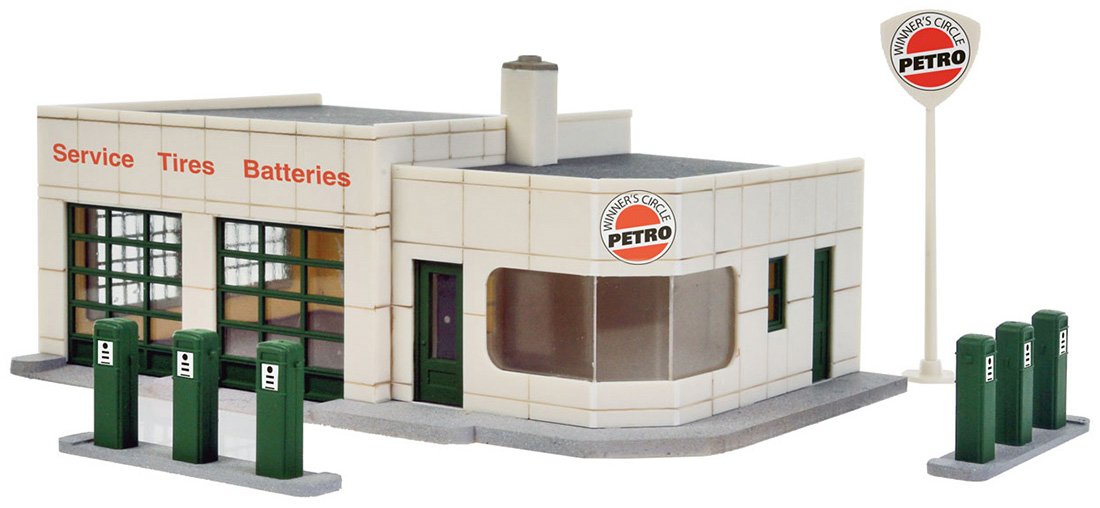 Features: All-American Design Used by Major Oil Companies and Independents; Found on Busy Streets from Late 1930s to the Present; Two Service Bays; Office Area; Two Large Roadside Signs; Two Complete Islands; Three Styles of Gas Pumps for 1930s, 50s and 80s Layouts; Colorful Decal Signs.