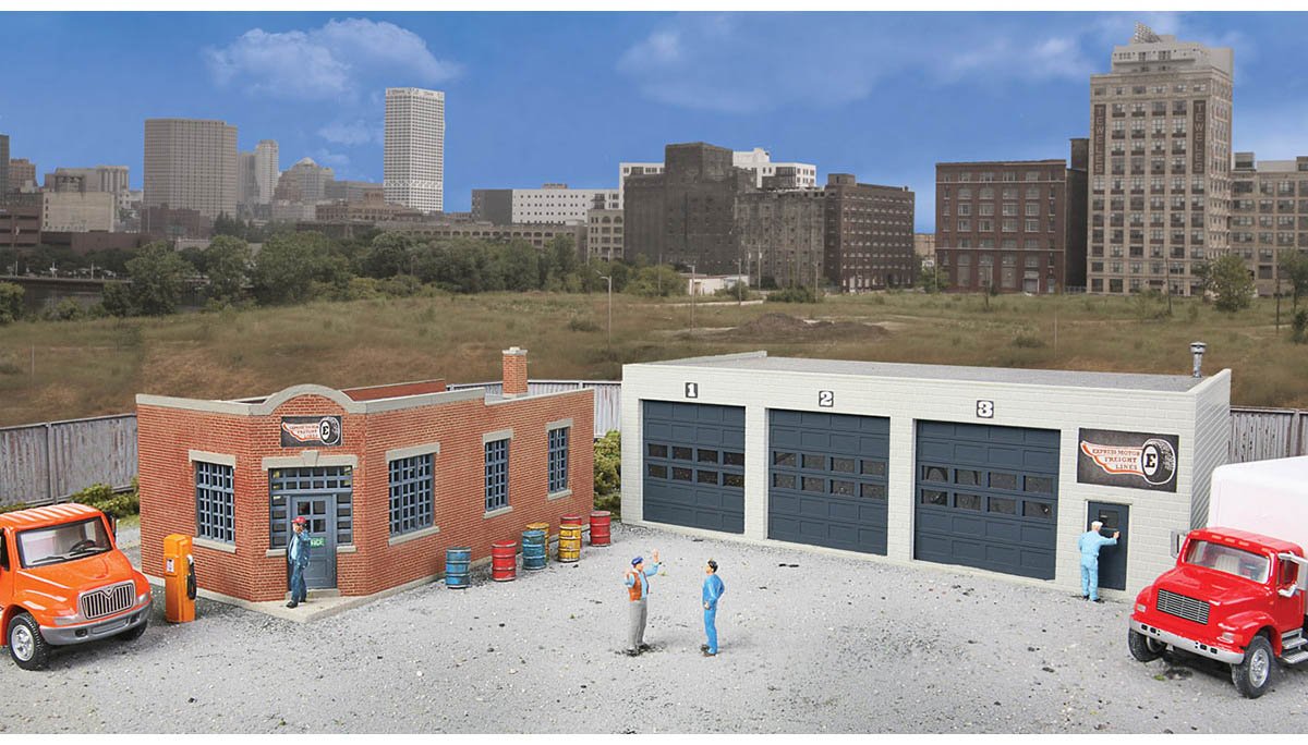 Features: Molded in Five Colors and Clear Plastic; Complete Trucking Facility in One Kit; Fits Late Steam- and Early Diesel-Era Layouts; Great Go-With Industrial Building for Vintage Piggyback Service; Detailed "Brick" Main Office; "Concrete Block" Garage - Build with Overhead Doors Open or Closed; Vintage Gas Pumps and Oil Drums; Colorful Printed Signs for Tanks & Gas Pumps.