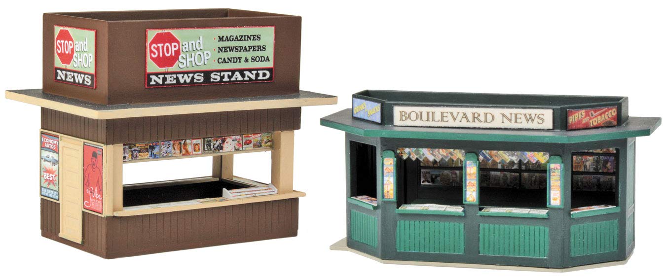 Whether offering magazines to train riders or newspapers downtown businessmen the Walthers Cornerstone HO Scale Newsstands look great in a variety of settings in any era. The kit has parts for two different news kiosks and includes detailed printed graphics of newspapers, magazines, candy displays and signs to add realism in any scene. Use the Newsstands at train stations, airports, ferry landings or along bustling streets in downtown to add interest to your layout scenes. The Newsstands kit will look great on your layout among other Cornerstone HO Scale businesses.
