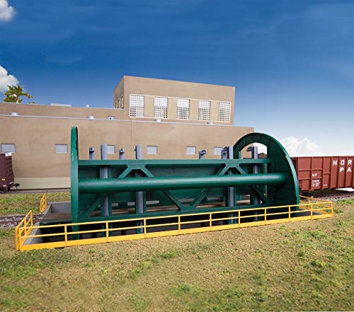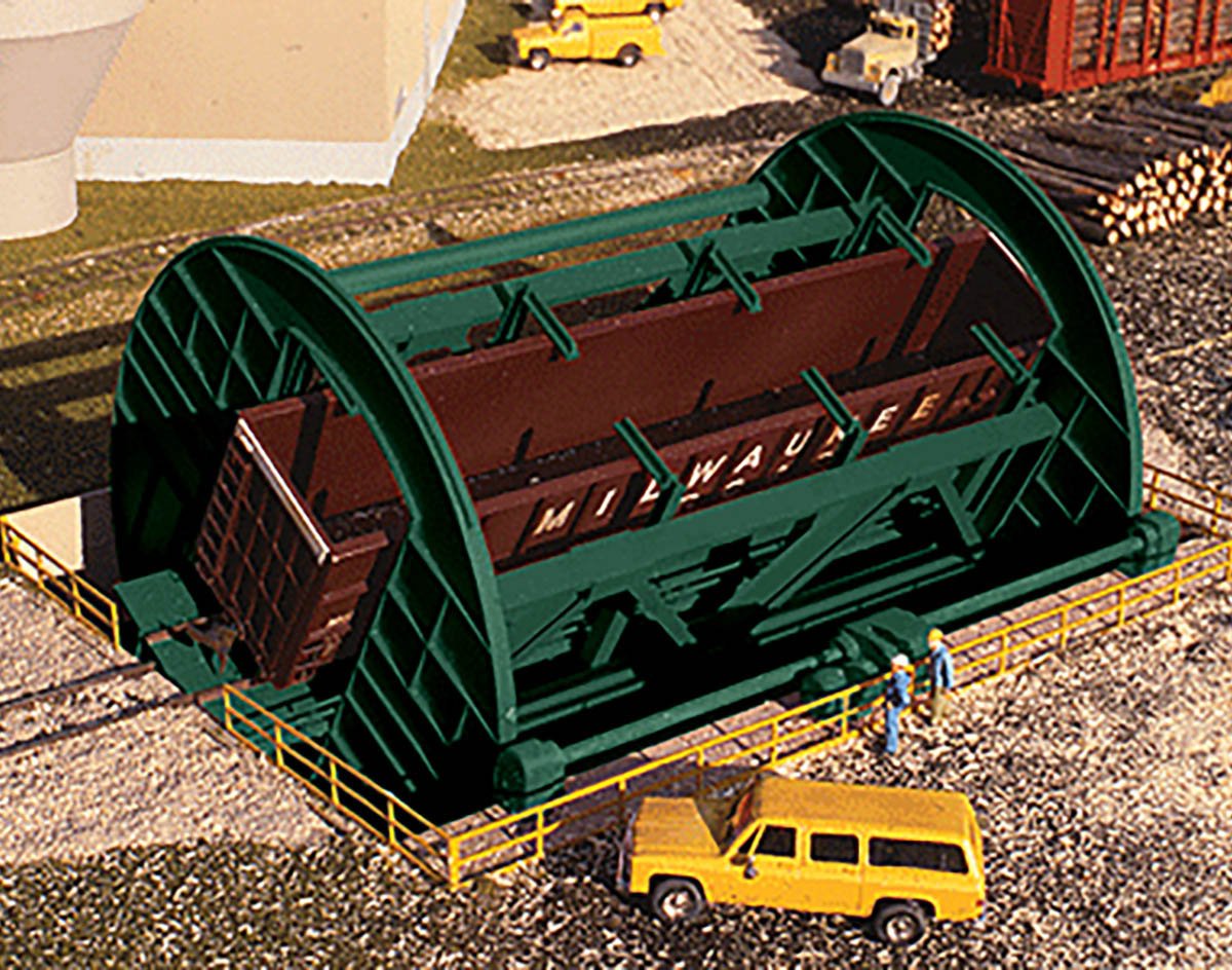 Paper mills that don't have their own debarking or chipping facility receive shipments of wood chips by train. They're unloaded quickly by spinning a clamped rail car around, dumping the load into a pit beneath the tracks. The wood chips are moved by conveyors and often piled high for storage outside the mill. Non-operating model.