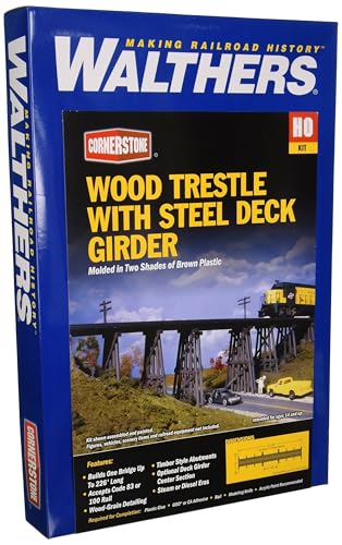 From the earliest days of railroading bridges like the Walthers Cornerstone Trestle with Deck Girder Bridge have been used to cross low spots, streams and other obstacles. In many cases a trestle was a cheaper, faster option for keeping construction moving. Trestles consist of a series of piers, called bents, which support the track. Wood was the favored building material until the 1940s, and many survive on branches and less busy lines to this day. Where piers could not be erected, such as in a flowing stream, a highway, or across another railroad, a deck girder bridge would be installed as part of the structure. This versatile kit opens lots of detailing options along your right-of-way. Perfect for use in virtually any era, the detailed plastic parts simulate the all-wood construction of the prototypes. The optional deck girder bridge gives you added flexibility, whether installed with existing scenery, or in planning new construction. Complete instructions make construction quick and easy. As shown the Trestle with Deck Girder Bridge measures: 15-1/2 x 4 x 4" 38.7 x 10 x 10cm