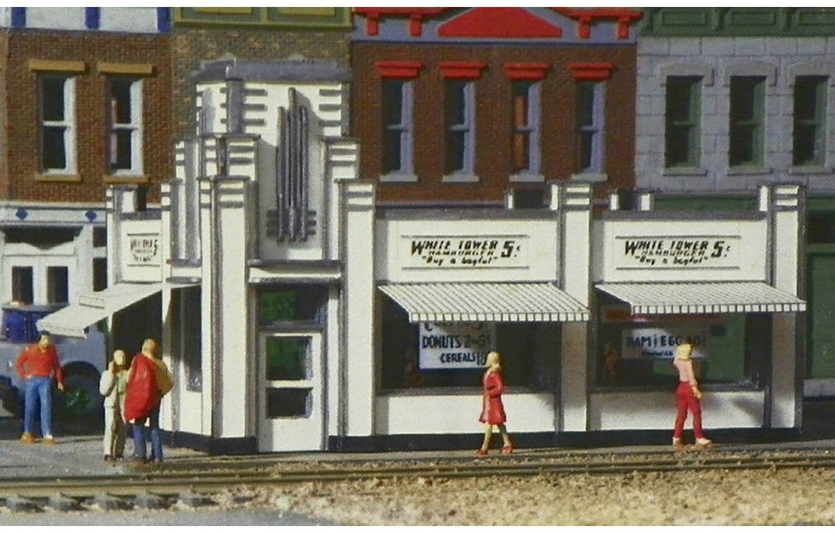 Mmmmmm . . . you can almost smell those juicy burgers and fresh onions as they sizzle on the grill. One of the first fast food chains in America, White Tower restaurants like this sprang up from coast to coast. A natural in any downtown or industrial area, the kit is complete with the intricate Art Deco style tower and colorful sign decals.