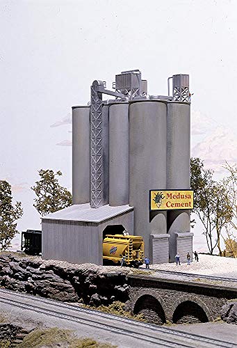 Hoppers full of powdered cement arrive at the Medusa Cement Company. cement distribution plants are vital to the construction industry, providing the bulk cement used to make concrete. This kit features eight tall storage silos, a conveyor tower and rail car unloading shed. Other details include separate roll-up doors plus separate rooftop details, including piping, dust collectors and more.