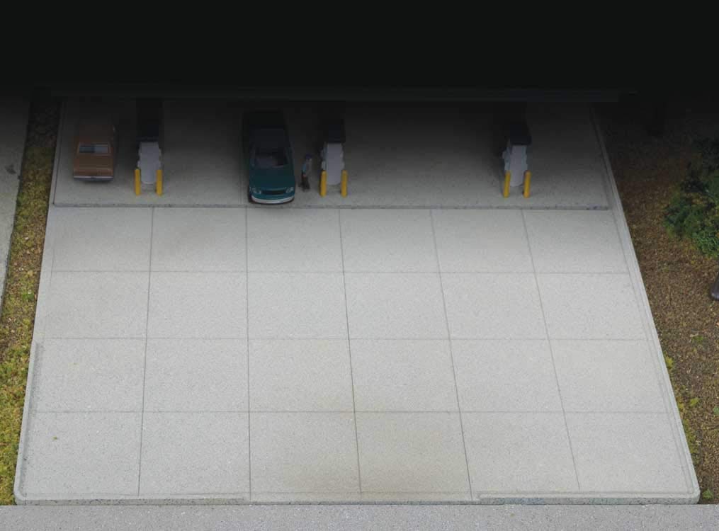 N Scale motorists will have no problems finding a place to park with the Modern Parking Lot Kit from Cornerstone(R)! Designed for easy assembly of parking lots big or small, molded cut lines also allow for quick and easy customizing. Perfect with the Modern Gas Station Kit (933-3885, sold separately) and adaptable to all sorts of structures, features include: