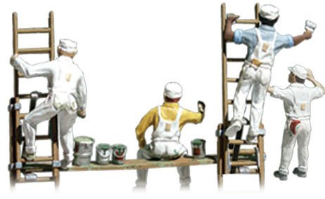 A set of men in white painter's overalls. White scaffolding, drums of paint and smaller cans of paint are included.