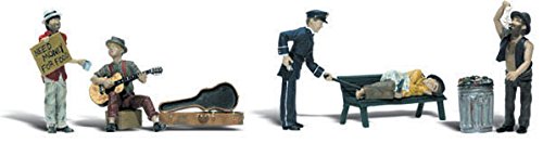 Set includes a policeman preparing to wake a bum as he sleeps on a park bench. A bum searches through the trash, one bum displays a "need money for food" sign and another strums his guitar.