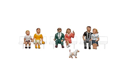 This set includes two men, three women, a child and a dog. A mother and her child wait, perhaps for a bus. A dog sits close by. A woman and man sit, engaged in conversation and another man and woman sit close together, just enjoying each other's company. Benches not included.