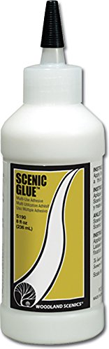 A specially-formulated, non-odorous adhesive for applying landscape materials. Scenic glue is a thick, flexible, strong-hold adhesive that dries clear with a matte finish. Water-soluble and non-toxic. Apply Scenic Glue and press scenery material into adhesive. 8 fl. oz. (236mL).