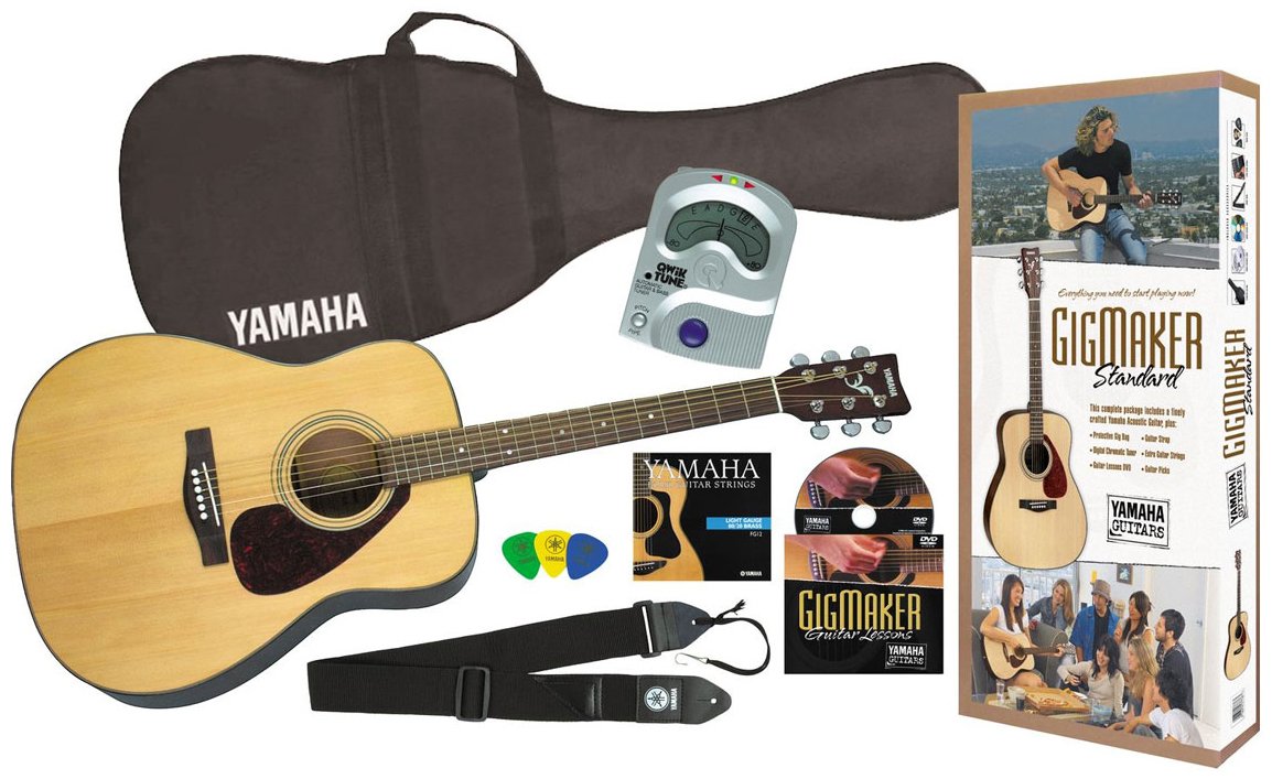 Yamaha is proud to present the new Gigmaker Standard. This is a great package that includes an F325 acoustic guitar-gig bag-digital tuner-DVD guitar lessons-strap-strings-and picks.