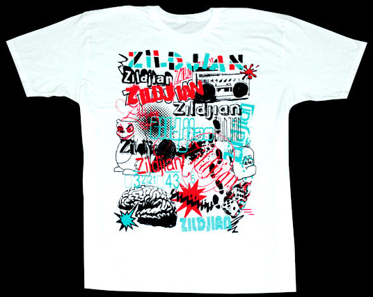 Check out Zildjian's giddy new 3 color design! This abstract T is a little bit punk and a lot playful, featuring a variety of logo treatments and dizzying images. The men's Scatter Brain T is slightly fitted, short sleeve jersey T and is 100% cotton. Available in S, M, L, XL.